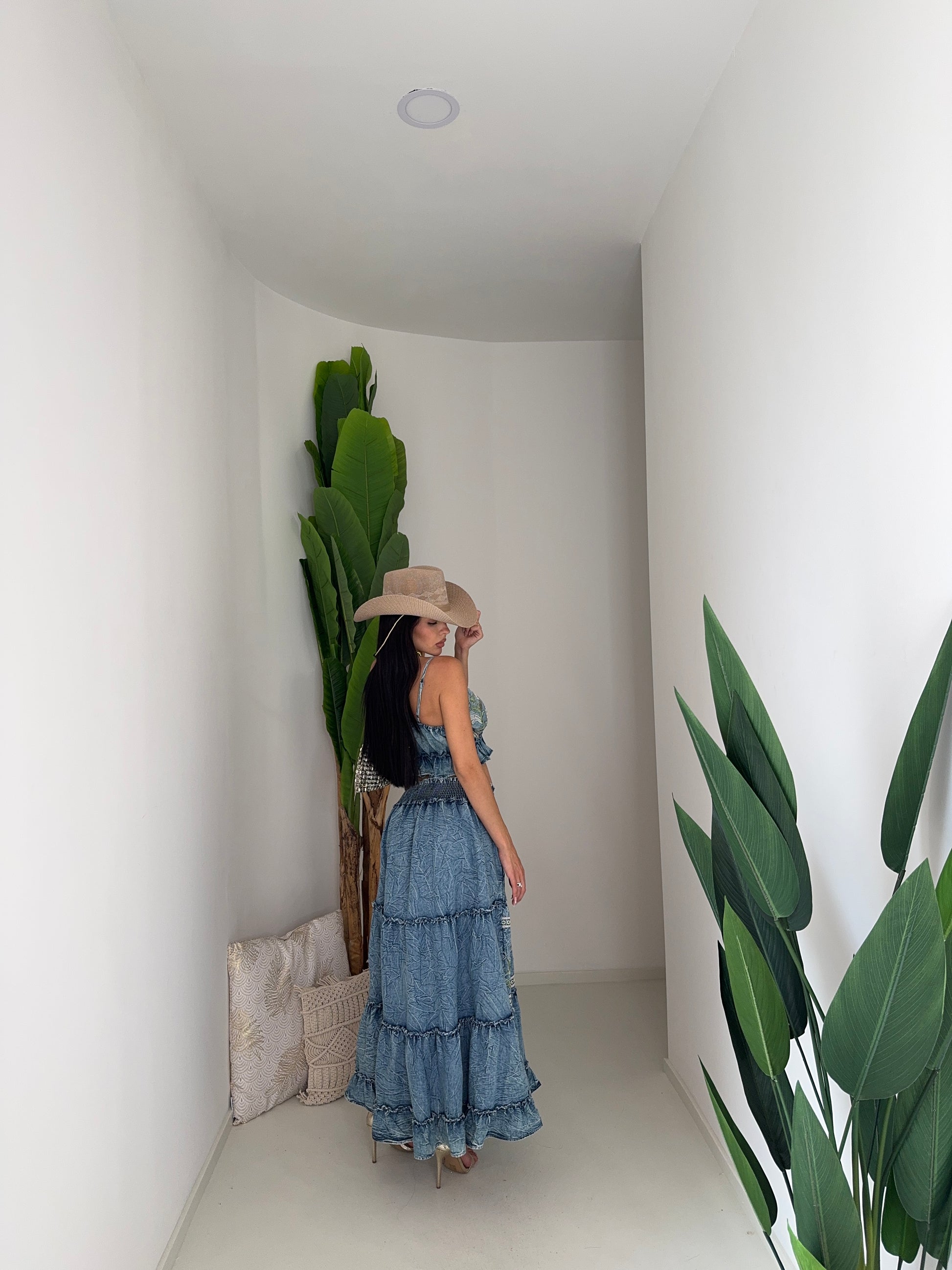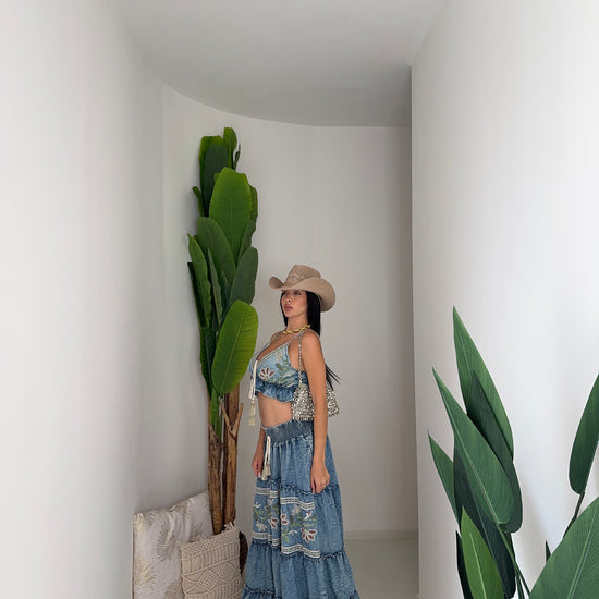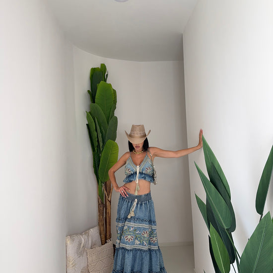 Maxi gonna in tessuto denim leggero, coordinata al top, con banda elastica in vita e stessa decorazione ricamata a motivi floreali. È composta da più balze che creano volume e movimento, donando un tocco femminile e romantico.